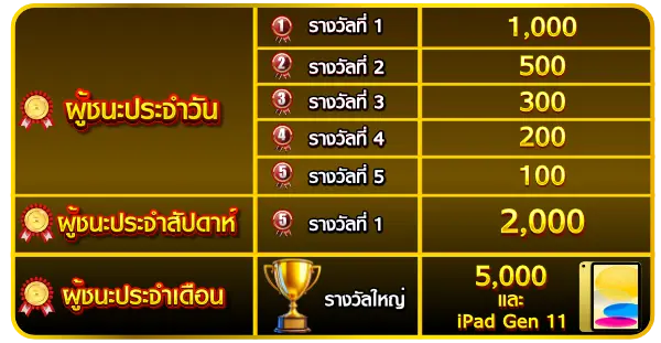3.ผู้ชนะประจำวัน : User ที่ทำโบนัสแตกสูงสุด 1 ตา ภายในวันจะถือว่าเป็นผู้ชนะแบ่งเป็น 5 รางวัล ตามลำดับโบนัส